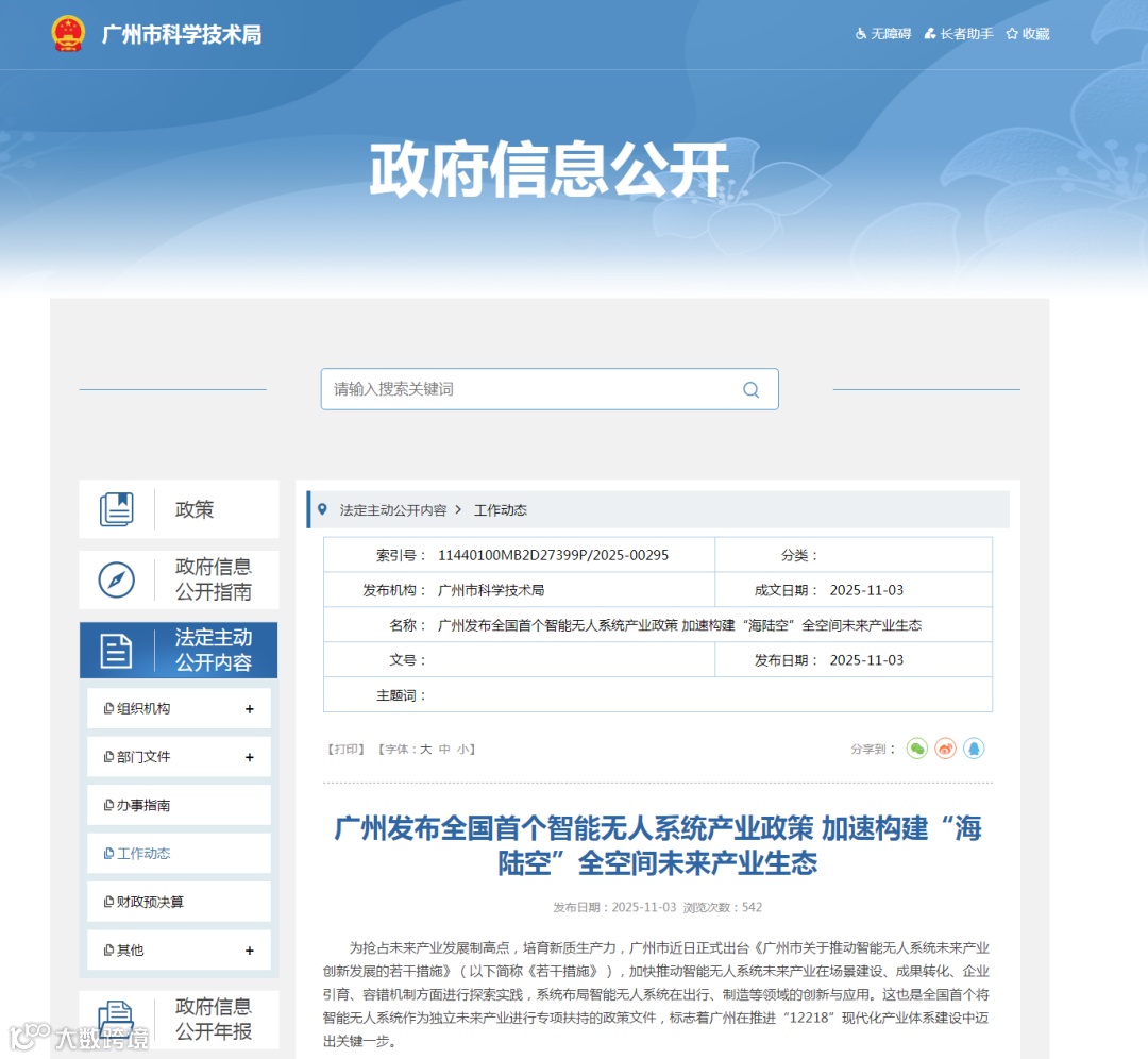 1、最高补助3000万元!广州发布全国首个智能无人系统产业政策