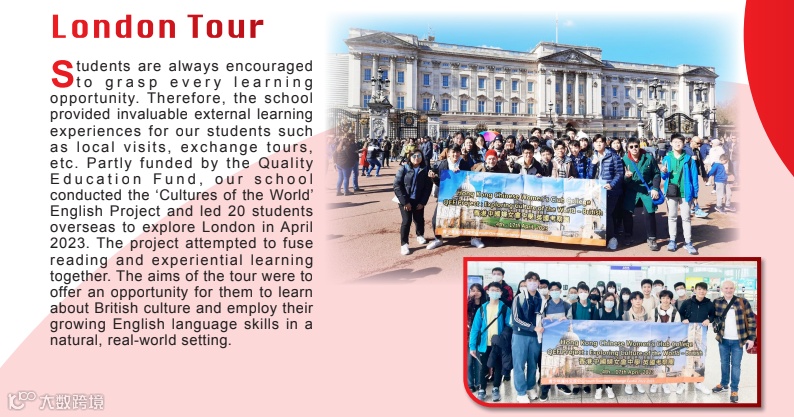 学生透过不同的对外交流活动,以开拓视野,丰富自己的其他学习经历,曾游学的地点包括韩国、日本、台湾、柬埔寨、越南、马来西亚、內蒙古、英国、非洲肯亚、南美洲亚马逊、新加坡、以至国内主要城市。