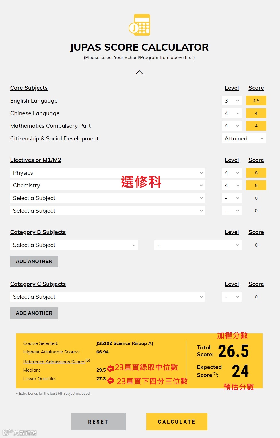 例如:以下是JS5102理学A组的结果。输入分数为中英数物化43444的一般成绩,裸分仅为5科19,加权后为5科26.5分。