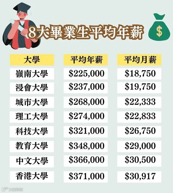 今天给大家整理了港八大毕业生薪酬排行榜以及港八大毕业生各科薪酬排行榜,快来看一看哪个高校/专业更有钱途?