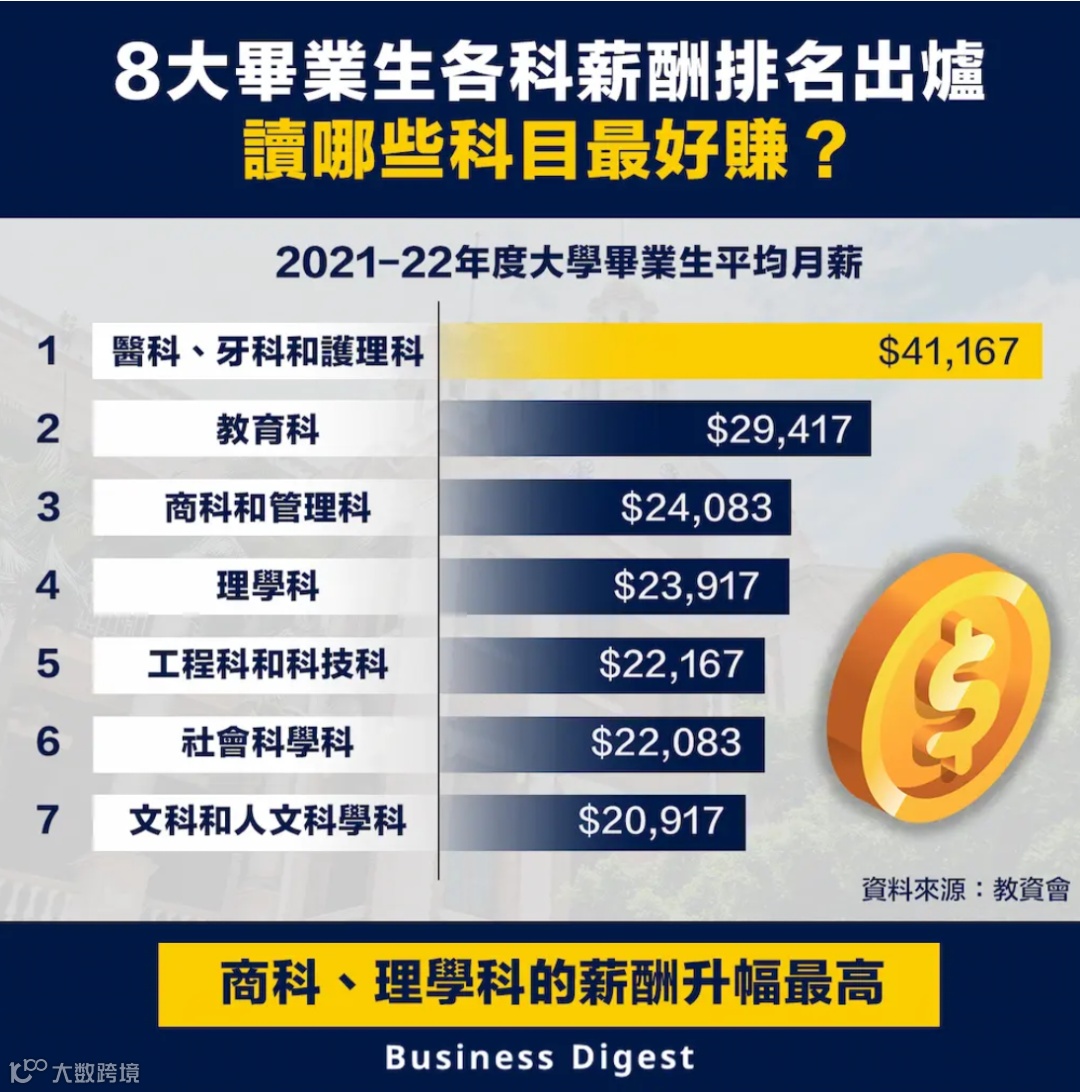 相信大家也很好奇,哪些专业在毕业后会更有钱途呢?根据大学教资会2023年所给出的数据,我们可以发现医科、牙科和护理科专业的同学们的薪水最高,接着是教育科、商科和管理科。