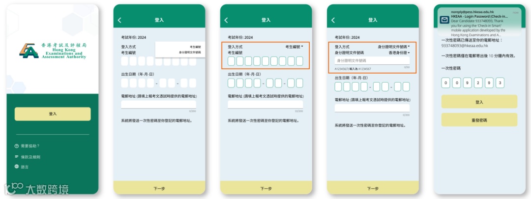 如果选择「身份证明文件号码」登入,请选择相应的身份证明文件类别。输入你的考生编号 /身份证明文件号码、出生日期及用作报考文凭试的电邮地址后,按「下一步」,然后输入由电邮收取的一次性密码以登入「报到易」。