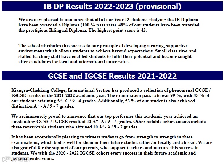 苏浙公学国际部同学的学业表现亦持续突出,IBDP 及 IGCSE 成绩远高于世界平均。2022-23学年,所有学习IB文凭的13年级学生都获得了文凭(100%通过率),48%的学生获得了著名的双语文凭,最高分是43分。