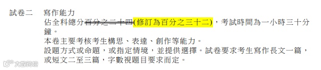 中文科四卷合并为两卷,并取消卷三「聆听及综合能力」和卷四「说话能力」。只剩下卷一「阅读理解」及卷二「写作能力」。