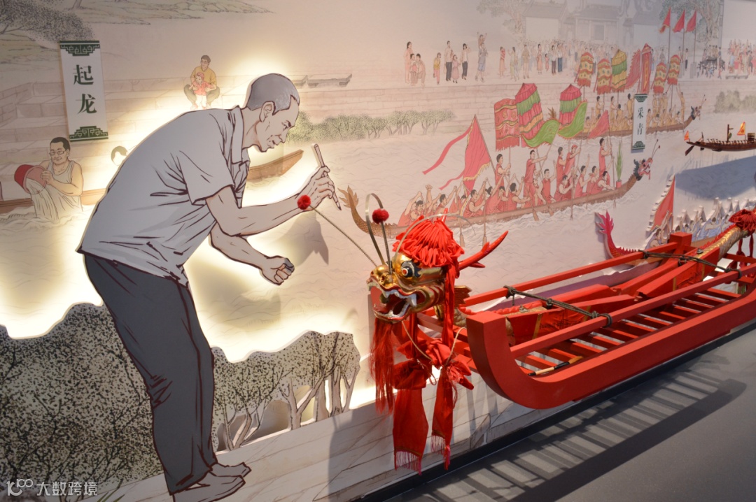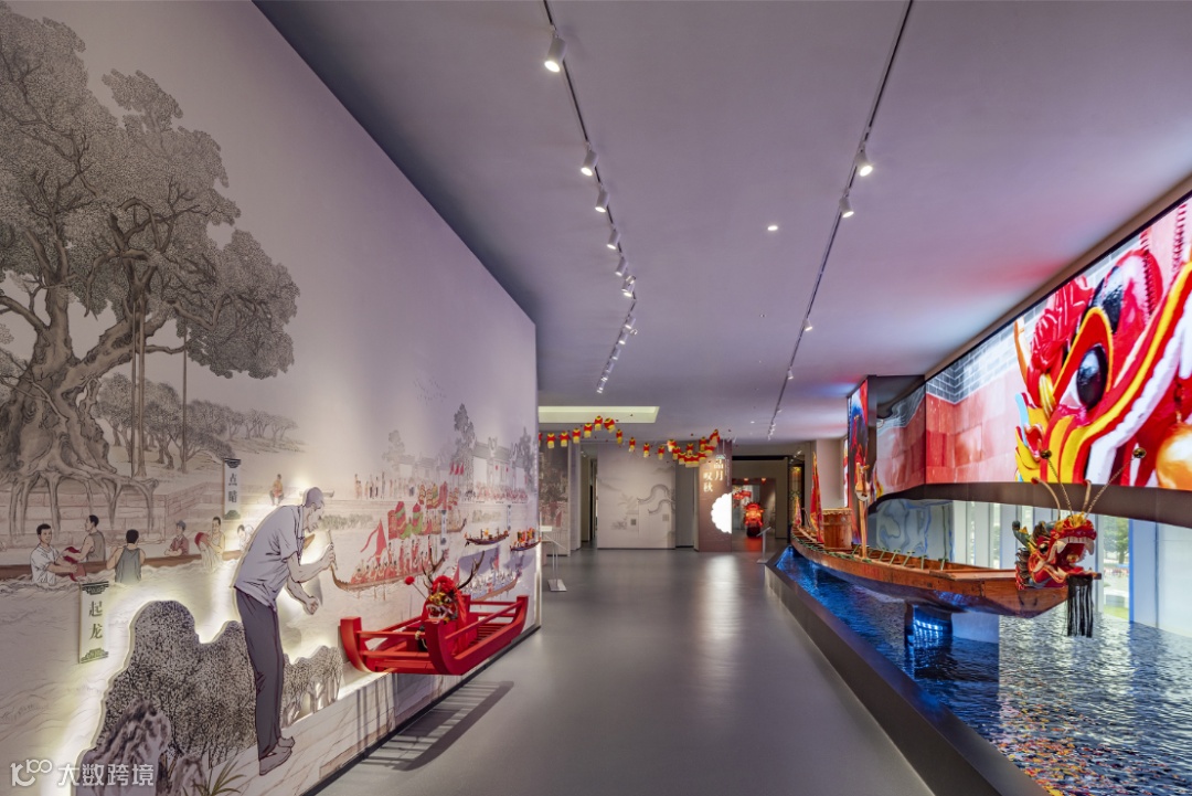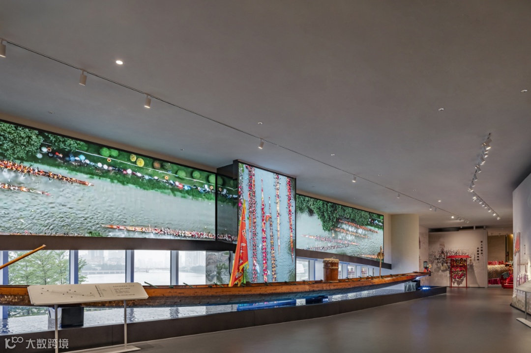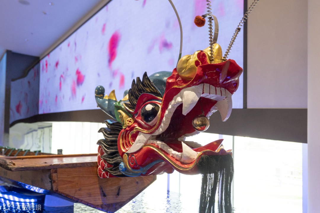 端午主题展厅在玻璃幕墙旁,设置了一条长20.98米东莞中堂龙舟(制作于1997年),龙舟底部地面采用波纹板与水纹灯的组合装置,呈现出波光粼粼的水面效果,映衬在龙舟的底部,营造动态氛围。