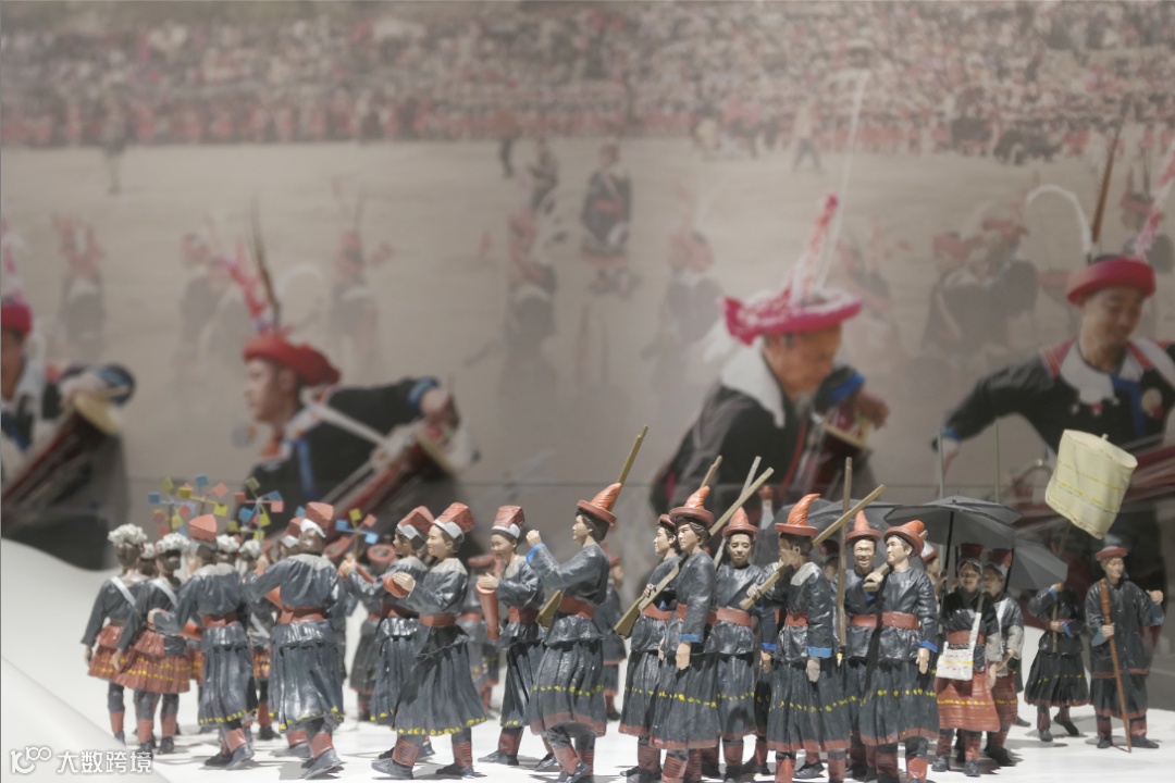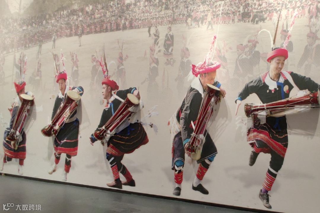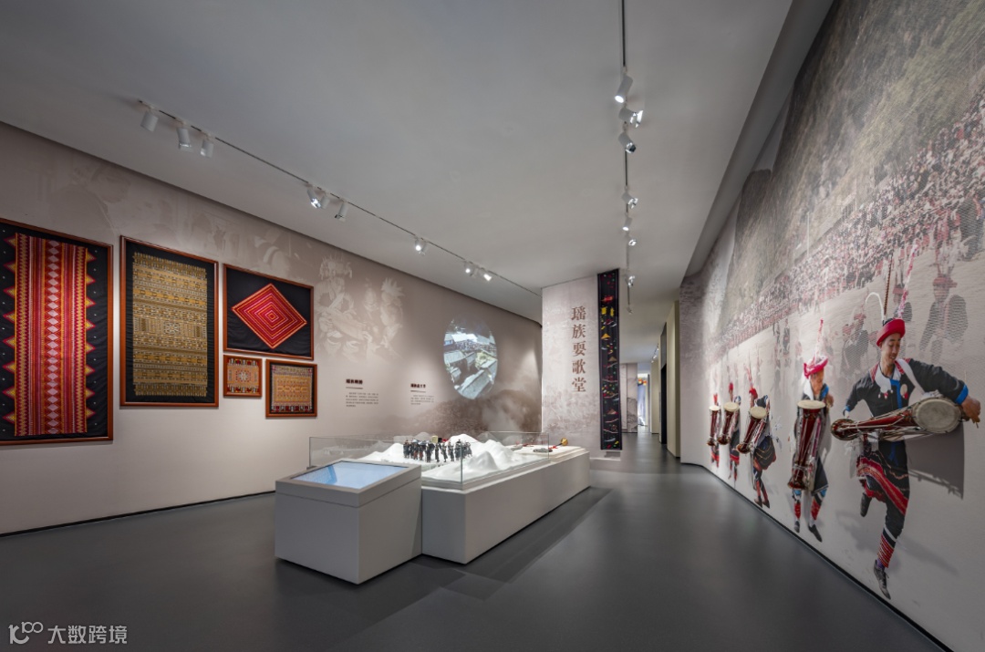 融合瑶族耍歌堂微缩场景、异形投影等多元形式,营造瑶族举办盘王盛会、纪念先祖功德的热烈氛围,陈列瑶族长鼓、纱锣等仪式器具,伴随古朴的歌舞步伐及音乐,再现瑶族庆祝丰收的仪庆盛会。