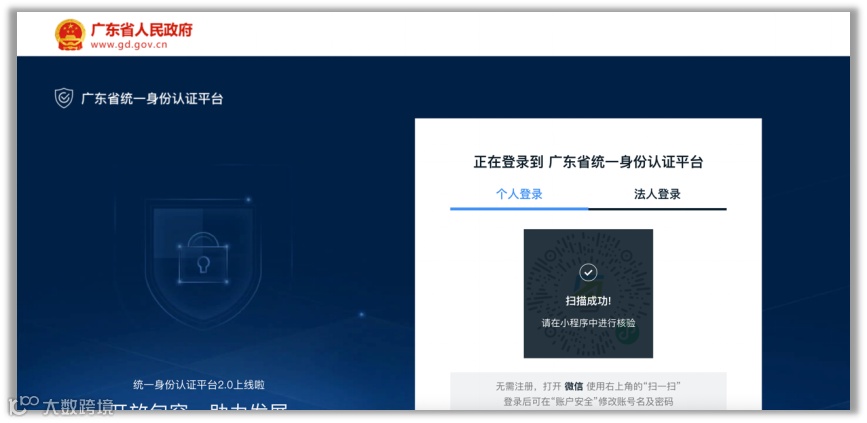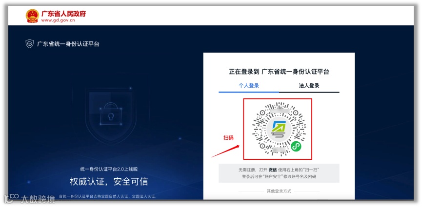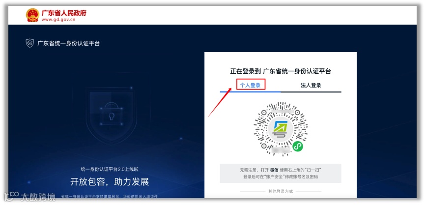 1.点击“立即报名”按钮,跳转到广东省统一身份认证平台登录页,选择“个人登录”,如下图: