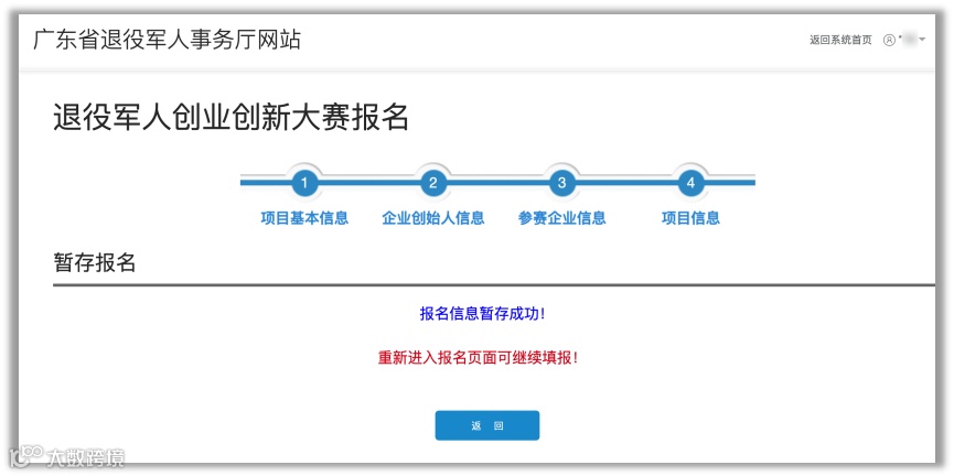 1.广东省退役军人创业创新大赛报名信息填写期间可以暂存而不正式提交,暂存后,重新进入报名信息填写页,可继续填写。点击页面下方“暂存”按钮,如下图: