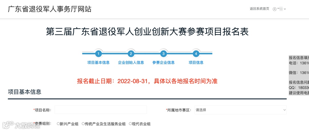 1.填写项目基本信息:项目名称、所属地市赛区、参赛组别(鼠标移入组别名称可查看组别定义)。如下图:
