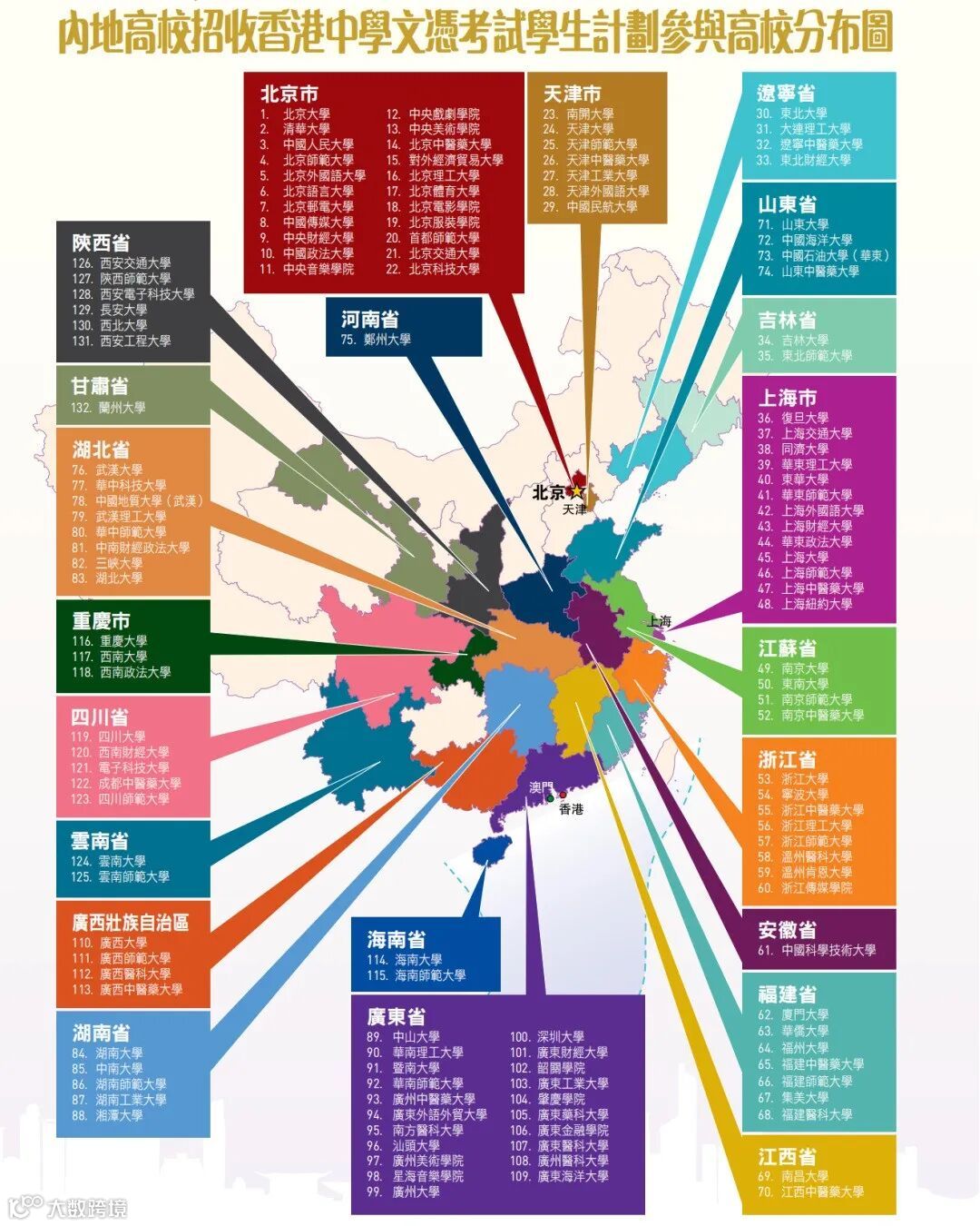 以下图片是参与23/24学年「文凭试收生计划」的内地高等院校共132所,遍布内地二十一个省份/直辖市及一个自治区。