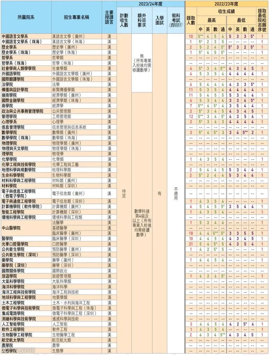 23/24年度中山大学计划招收人数待定,除语言类、历史类、哲学类、社会学类、外国语言文学类及法学类专业外,其余类专业需数学科达第4级及以上(所有专业入校后均需修读数学)部分专业有附加选修科目要求,详情点击下图查看。