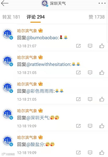深圳天气接收了冷空气和台风,但将雪拒之门外,还贴心地告知去0451哈尔滨窗口办理,出门右转直行2600公里。闻讯赶来的哈尔滨气象,直接在深圳天气的微博下狂刷60多条评论,差点被打。