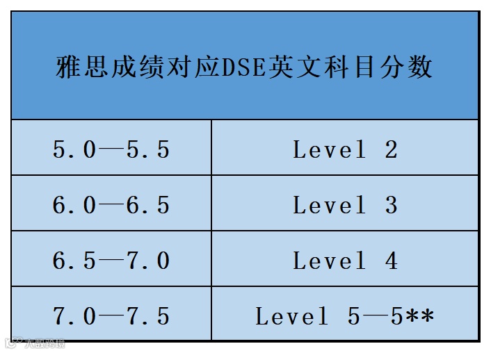 其次,雅思成绩可以较为直接地反应DSE成绩。依据多年的经验,雅思成绩和DSE英文成绩有一个对照表,具体如下(仅供参考):