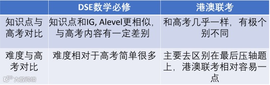 DSE的数学内容和国外高中的知识体系更为相似,与英国考试体系的IG,Alevel非常相似,可以看成是IG, Alevel考试内容的中文版。