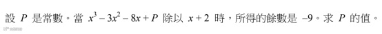 那么在这一题中,多项式,除以(x+2),所以a=-2,根据定理,余项为,题目条件指出余项为-9,所以,所以P=-5