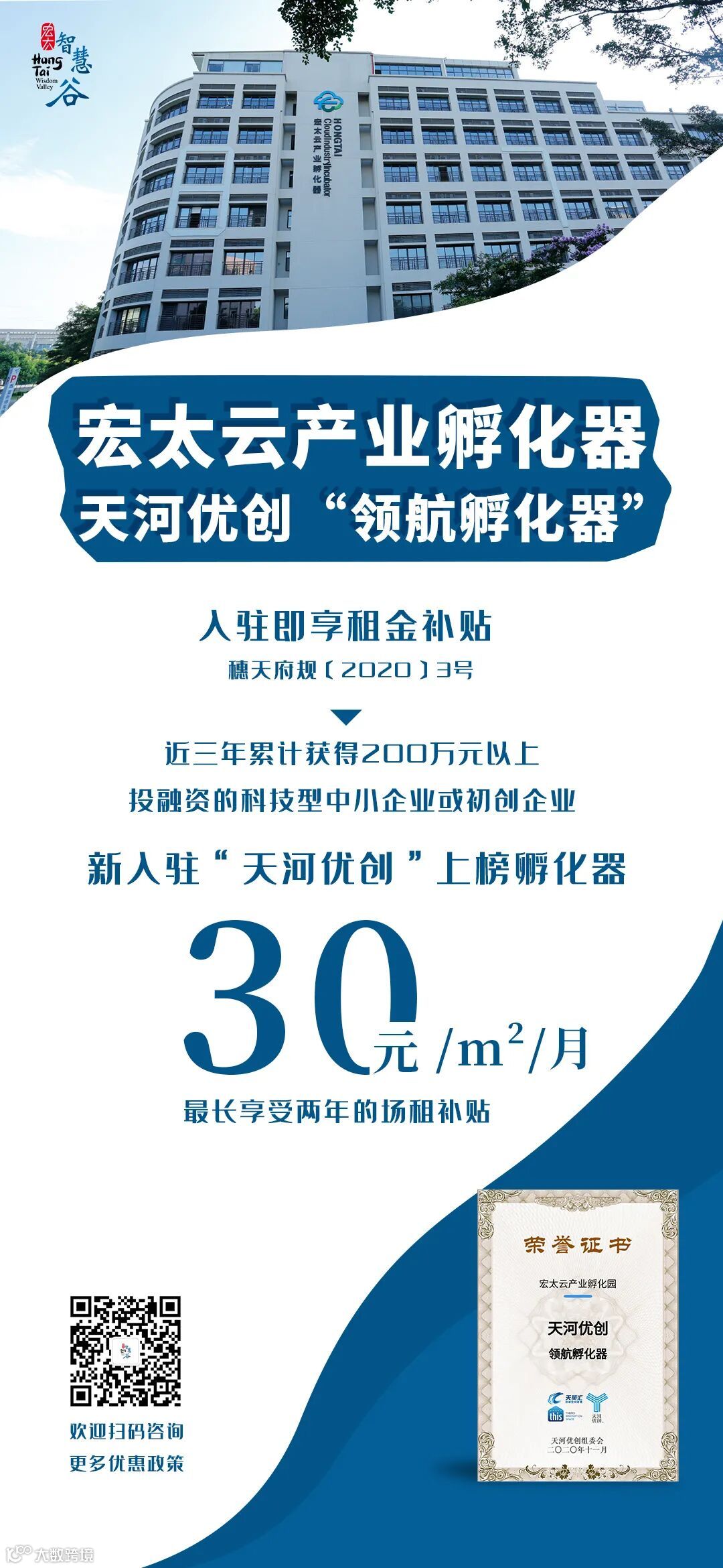 《意见》将于2021年1月1日起正式实施,这意味着从明年起,科创主体新入驻宏太云产业孵化器每月享受场地补贴30元/㎡,最长可享2年!
