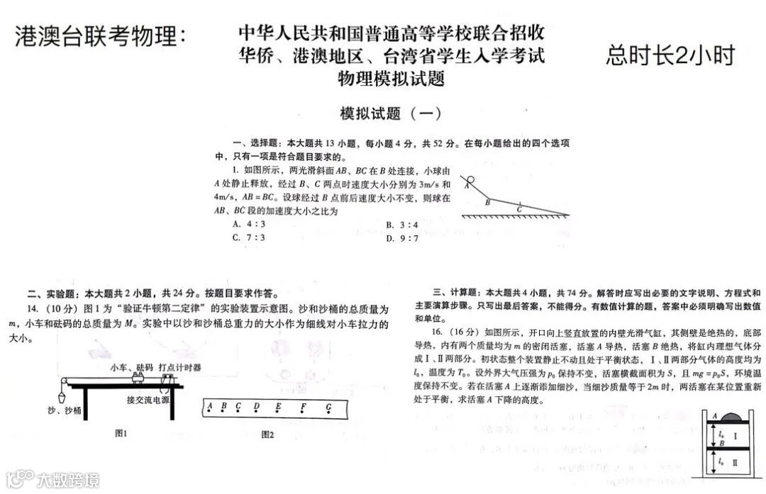 港澳联考的物理大纲基本上是和高考重合的,难度略低于高考,题型为单选题,实验题和计算题没有多选题。