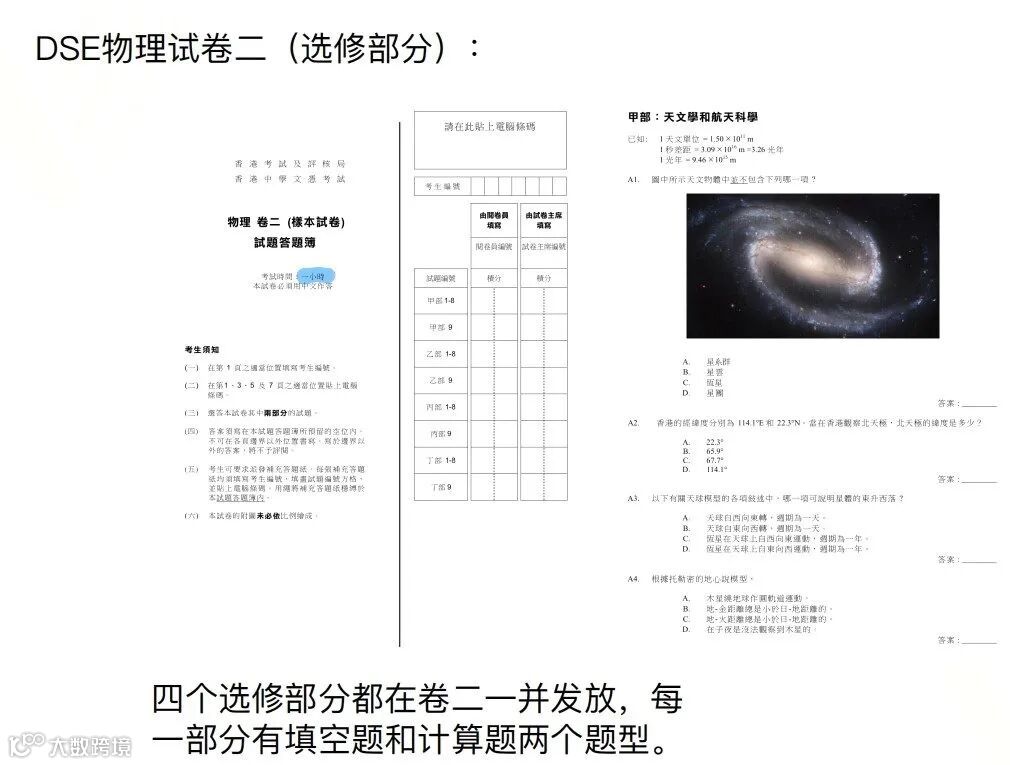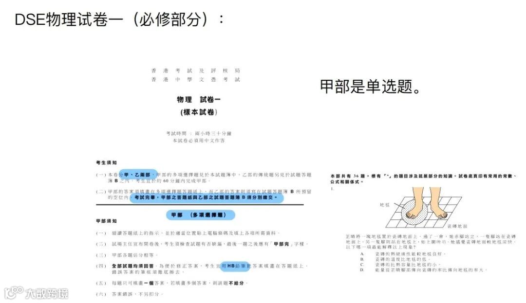 DSE物理分为卷一与卷二两场考试,卷一为必修内容,卷二为选修内容,两场考试时长分别为2小时30分钟和1小时时间。
