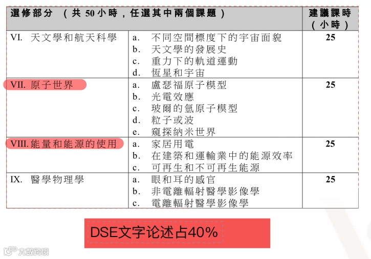 同学们在物理选修部分大多数是选择原子世界、能量和能源的使用。这两部分的选修有大量新的概念需要同学们记忆和学习,DSE相比高考而言文字论述占比更高,占比40%。