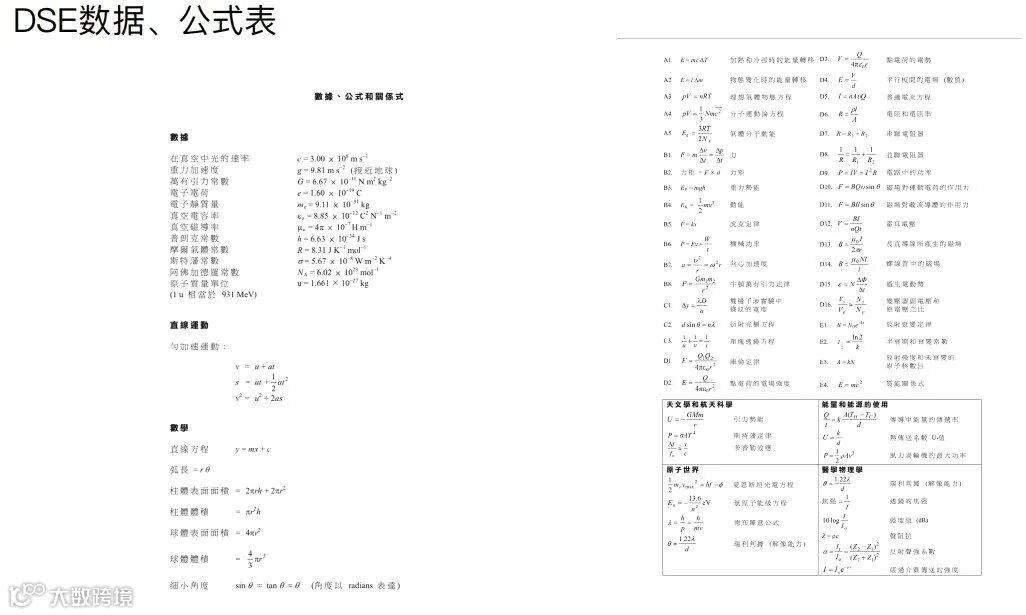 DSE考试相对前两者⽽⾔知识⾯⽐较⼴阔,但是具体物理场景的数学分析相对简单,遇到⽐较难处理的数据会有计算器辅助运算。物理学常量和公式可以查询提供的表格。