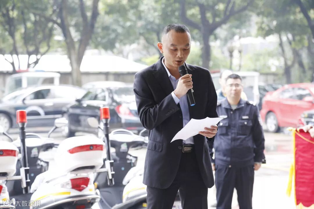 随后,宏太智慧谷董事长江枚元亲自为防控大队送上锦旗,并将慰问物资30箱矿泉水和6辆五羊摩托车一并交接。