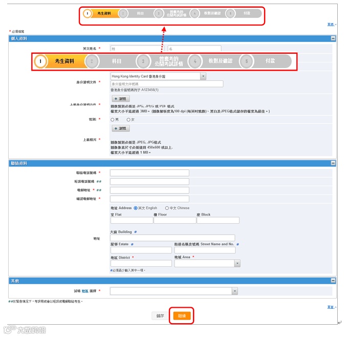 重要提示:当你完成输入报考数据后,你可随时按版面上的[储存]键以储存你已输入的报考数据,并于报名期间内,待下次登入报名系统时继续报名程序。