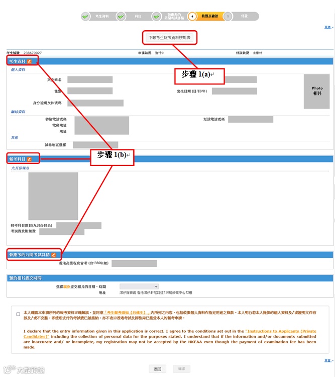 核对报考数据后,勾选声明旁的方格,并按[确认]以提交报名申请予考评局。如你确认所有报考数据正确 无误,按[确定]以提交报名申请予考评局。