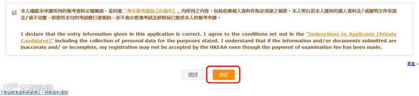 核对报考资料后,勾选声明旁的方格,并按[确认]以提交报名申请予考评局。