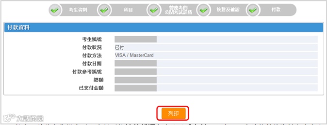 缴妥考试费后,系统会显示「付款数据」版面。如你使用信用卡付款成功,系统会立即更新显示的付款资 料。