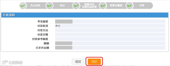如你透过 7-Eleven 或 OK 便利店、缴费灵或网上银行服务缴交考试费,由于相关手续需要约两个工作天处理及核实,故此在你缴费后,本版面的付款状况仍会显示「未付」讯息,而有关的付款资料亦会留空;直至缴费交易获核实后,本版面的付款状况才会更新为「已付」。