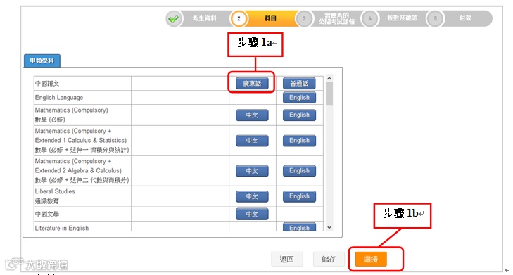 重复以上步骤直至输入所有报考科目。按[储存]以保存你的选择。你亦可直接按[继续]前往下一版面, 系统会于你离开本版面前显示对话框,请按对话框的[确定]已储存版面的数据。