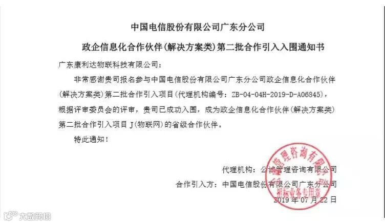 近日,中国电信广东分公司发布了“政企信息化合作伙伴首批招募项目”评审结果,康利达物联作为中国物联网智能数据采集技术的研发、应用、推广的先行者,凭借实力成功入围,正式成为广东电信政企信息化合作伙伴。