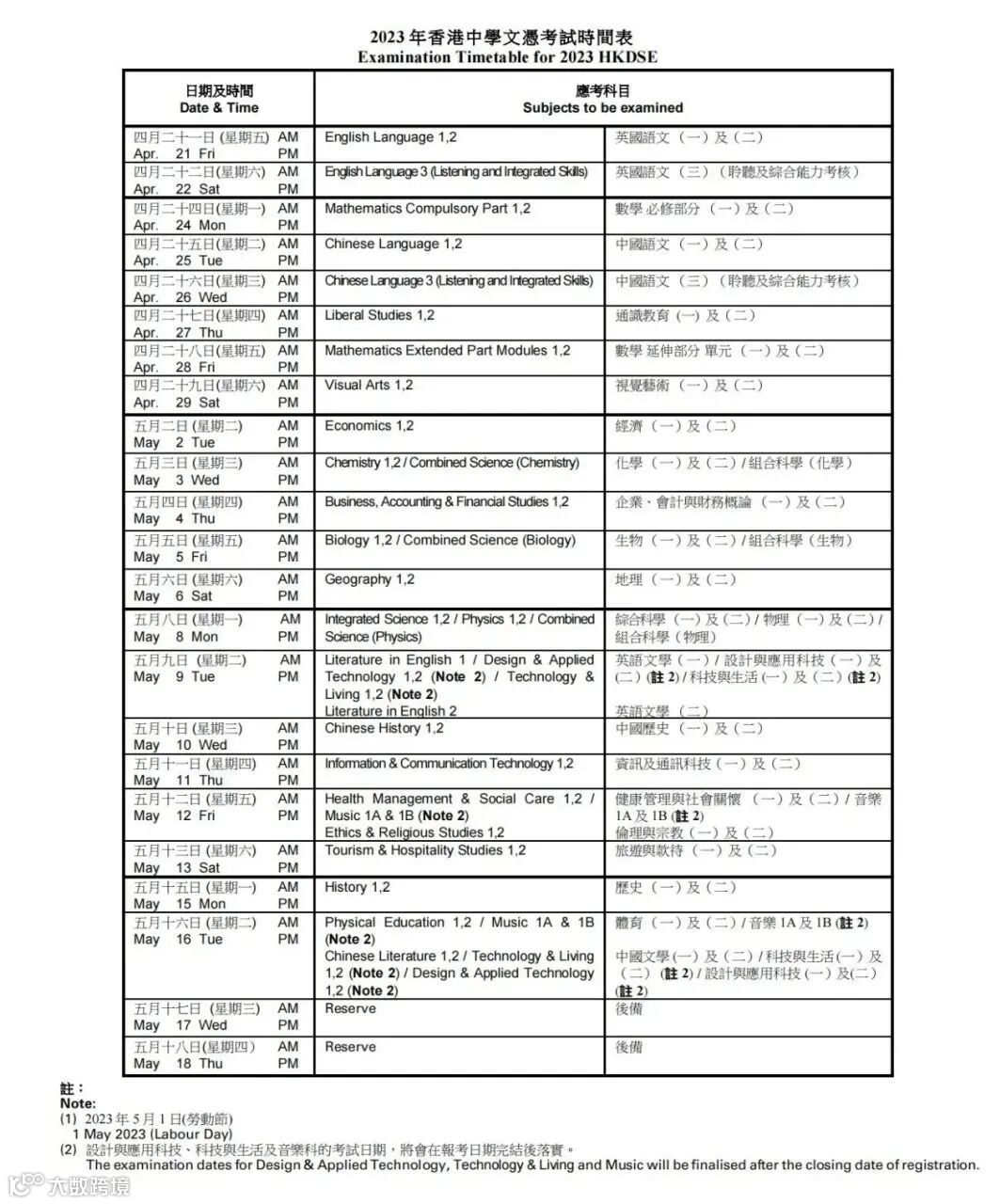 香港考试及评核局公布了2023年香港中学文凭考试时间表如下,4门核心科目以及甲类选修科考试将在2023年4月21日——5月18日期间进行。