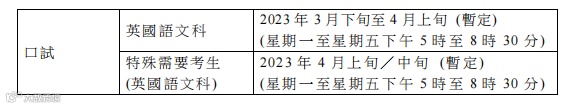 今届(2022年)DSE英文口试因疫情而被取消,而下届(2023年)则暂定于3月下旬至4月上旬的星期一至五举行;