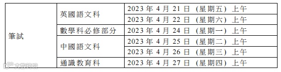 1、笔试将于4月21日开始,四个核心科(英国语文科、数学科必修部分、中国语文科和通识教育科)的考试将2023 年4月21至22日及4月24至27日进行;
