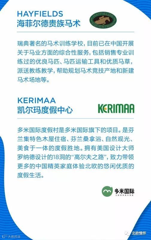 旗下品牌“北欧情怀”通过线上格调美文,线下“北欧情怀吧”生活馆,北欧体验式文化主题之旅、贵族马术、商业、文化交流开展各类项目资源对接与合作。