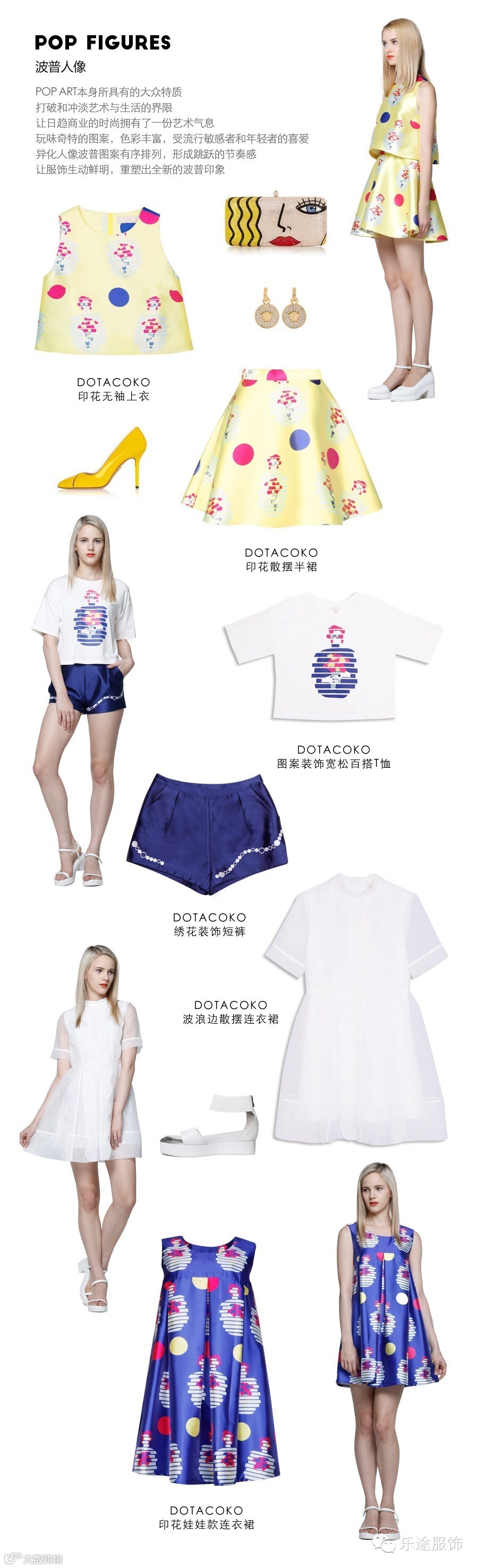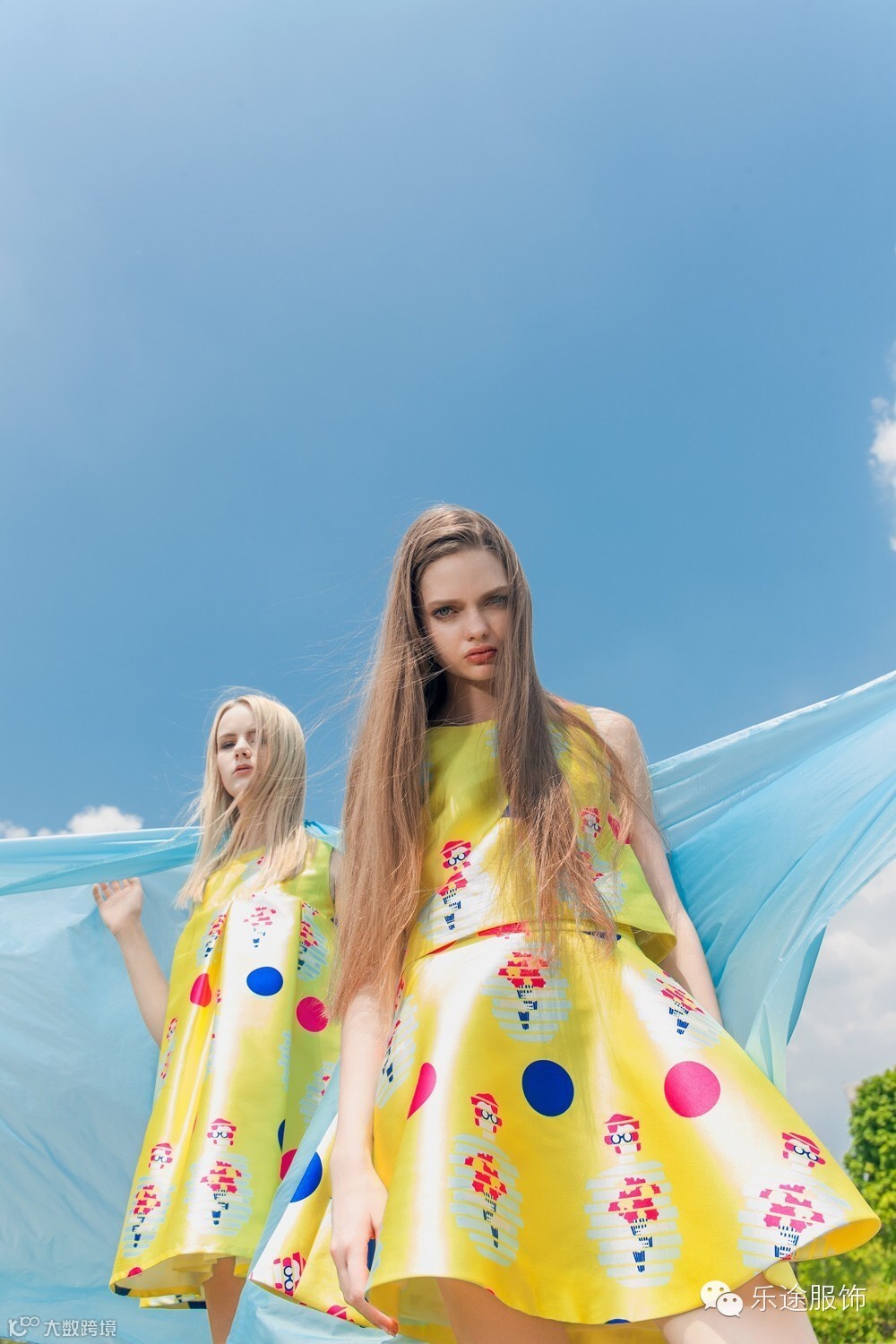 此系列追溯回60年代的经典波普艺术,用异化抽象的人像印花和波点印花组合排列,错乱的节奏感呈现出新式的现代波普,用高亮度的色彩碰撞,带着一丝俏皮活力,娃娃衫廓形连衣裙,A字伞裙,超短上衣...极简的线条下不经意间将女性活泼小优雅的一面抒写的淋漓尽致。