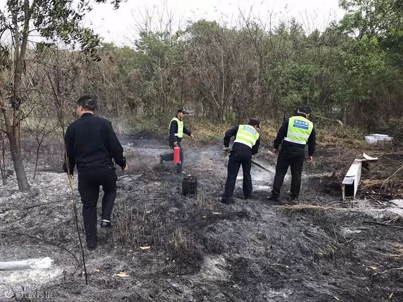 (扑灭明火后,防控队员处理现场防止复燃)