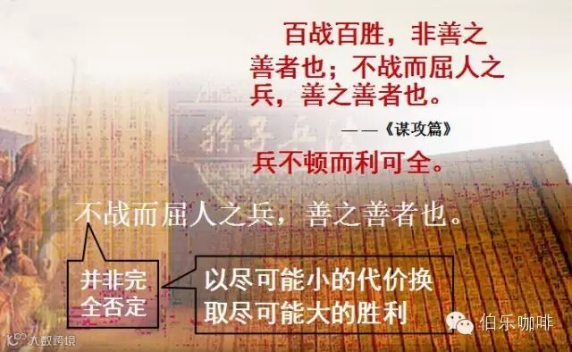 “不战”并非是全然的否定,而是以尽可能小的代价换取尽可能大的胜利,这是一种步步为营的睿智和沉稳。上兵伐谋,以谋划乱对手方寸;其次伐交,从外交上分解联盟使之孤立无援;其次伐兵,军事上打击,不必四面开花;其下攻城,抓住要害,以最小代价取胜。