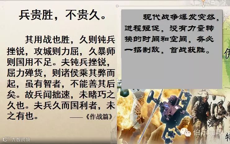 在伯乐大讲堂上,薛将军指出国与国之间的斡旋和竞争需要运用战略竞争的观点和手段,而《孙子兵法》为我们提供了诸多值得借鉴的指导思想。关于这部成熟最早、声誉最高、影响最大且流传最广的兵家宝典《孙子兵法》,薛将军归纳出五大战争战略思想要点:高度重视战争、周密准备战争、以智慧求安全、以实力保安全和战则速战速决。他从《孙子兵法》战争原则谈起,结合历史典故和现代国防安全实例,精要地分析了古代军事思想精髓的现代借鉴意义以及当下中国国防安全重要议题。