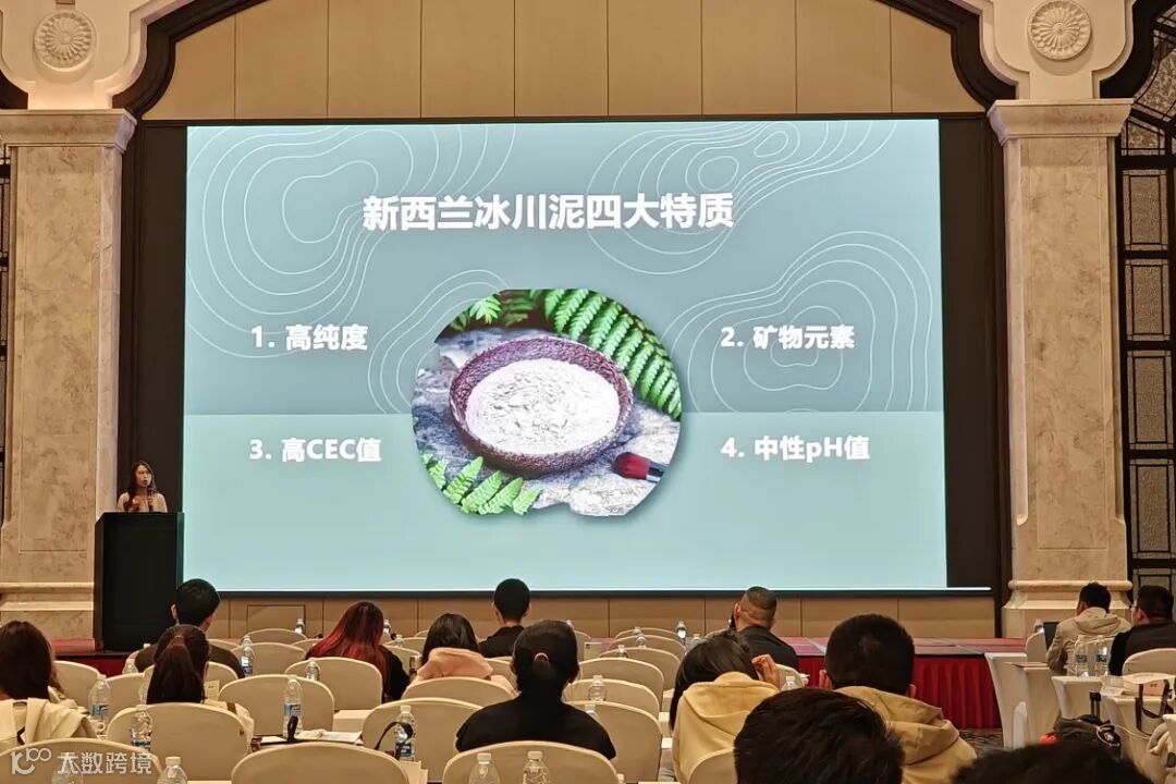 Glacial Clay International Ltd国际市场营销总监Jennifer Wu给观众展示新西兰冰川泥高纯度、富含矿物质元素、高CEC值、pH值中性四大特质。与其他粘土相比,新西兰冰川泥有着能够深层净化肌肤,滋养修复,焕活提亮等优势,在海外市场深受消费者喜爱。