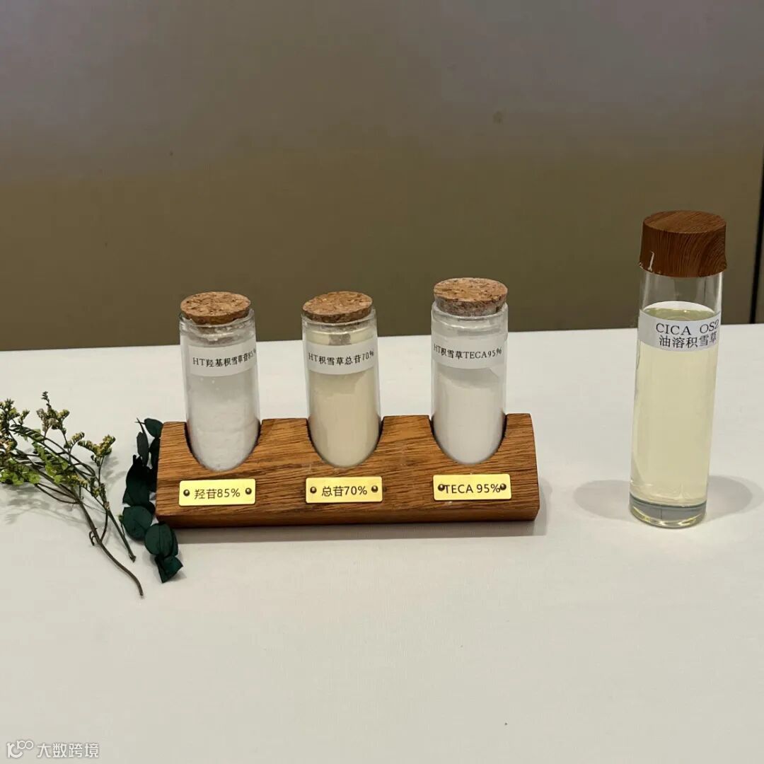 积雪草提取物含有三萜皂苷已知约四十种,黄酮类物质约十种还有挥发油、多炔烯烃等,根据结构的不同分为积雪草苷、羟基积雪草苷、积雪草酸、羟基积雪草酸。