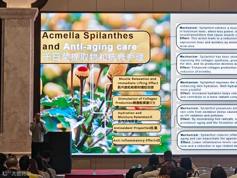 千日菊提取物被称为“植物类肉毒素”,主要活性成分为千日菊酰胺,应用在化妆品领域有着即时祛皱的功效,通过阻断神经递质传输路径,抚平动态纹、表情纹。