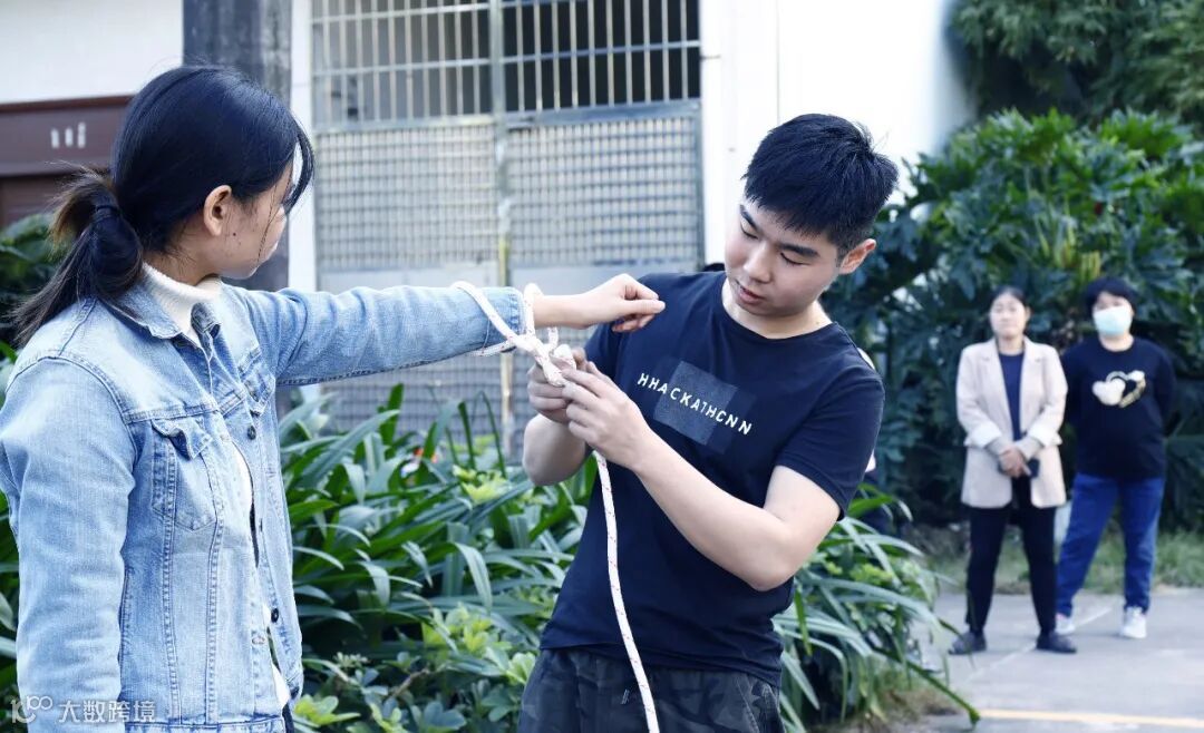 现场示范使用灭火器,并教学水枪、防毒面具和结绳法逃生。