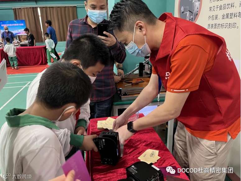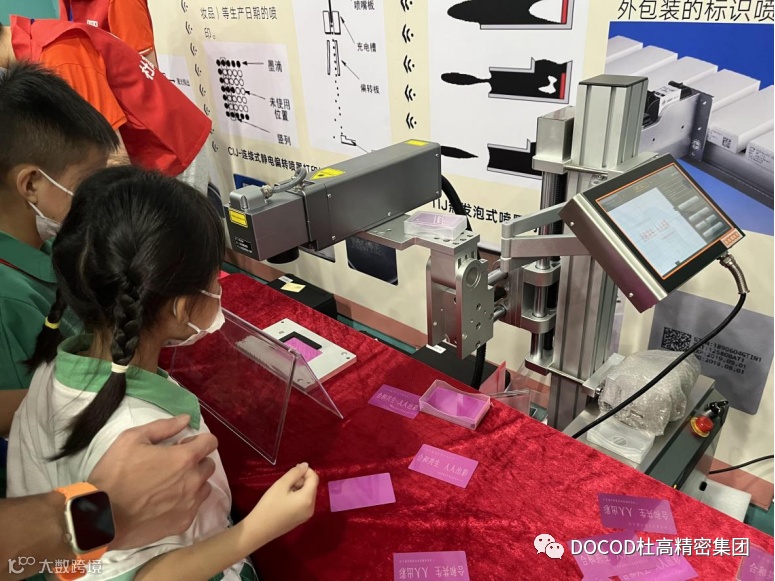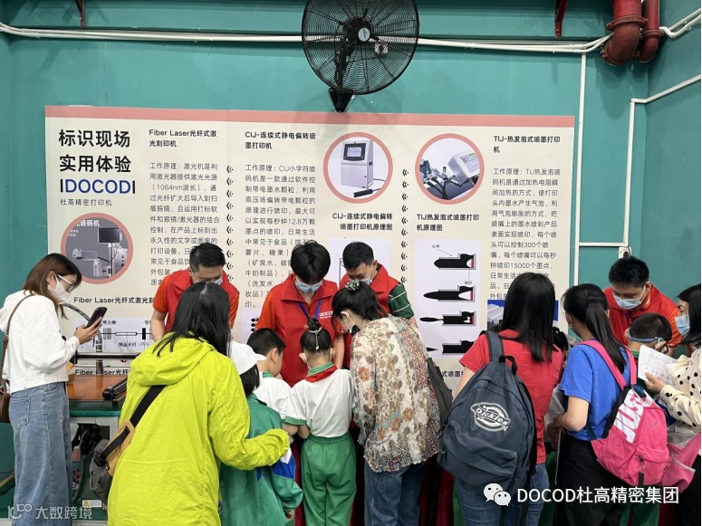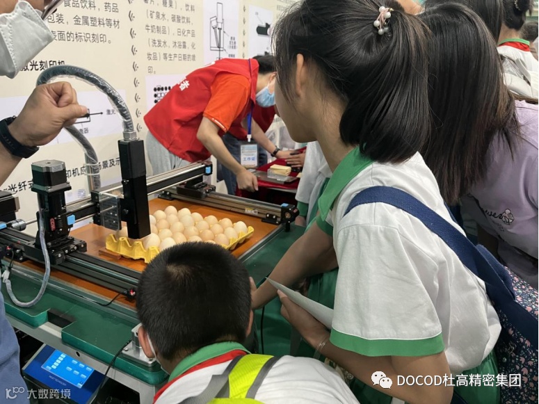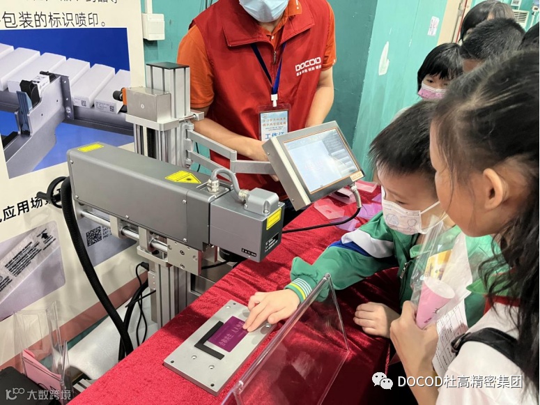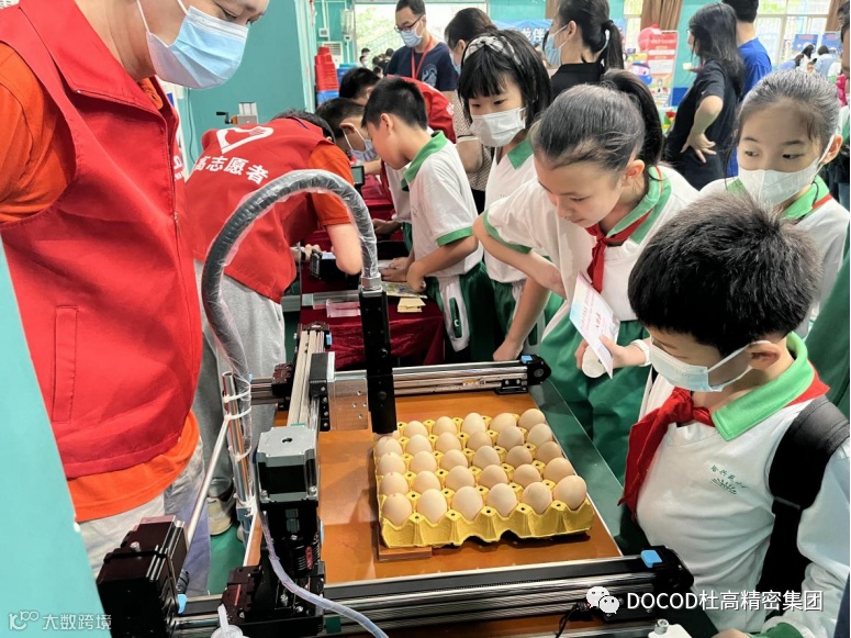 DOCOD杜高精密集团5月13日(周六)9:00-14:00,杜高精密集团的几位志愿者,来到了荔湾区合兴苑小学,参加家校社协同共育的嘉年华活动。作为嘉年华科学大舞台部分的一员,我们向现场的孩子们展示了CIJ鸡蛋喷码、TIJ手持喷印和激光机打码技术,许多小同学都对我们的产品产生了浓厚的兴趣,认真看工程师们演示的同时也跃跃欲试,有一些人甚至还在工程师的指导下,自己动手操作了起来。
