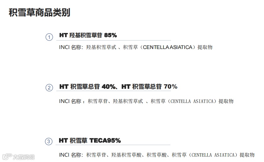 本次研讨会,亮相的原料有HT羟基积雪草苷85%、HT 积雪草总苷40%、HT 积雪草总苷70%、HT 积雪草 TECA95%等,具有抗衰老、抗氧化、皮肤修复(疤痕、妊娠纹)、美白保湿等多种功效,全方位解决肌肤问题。