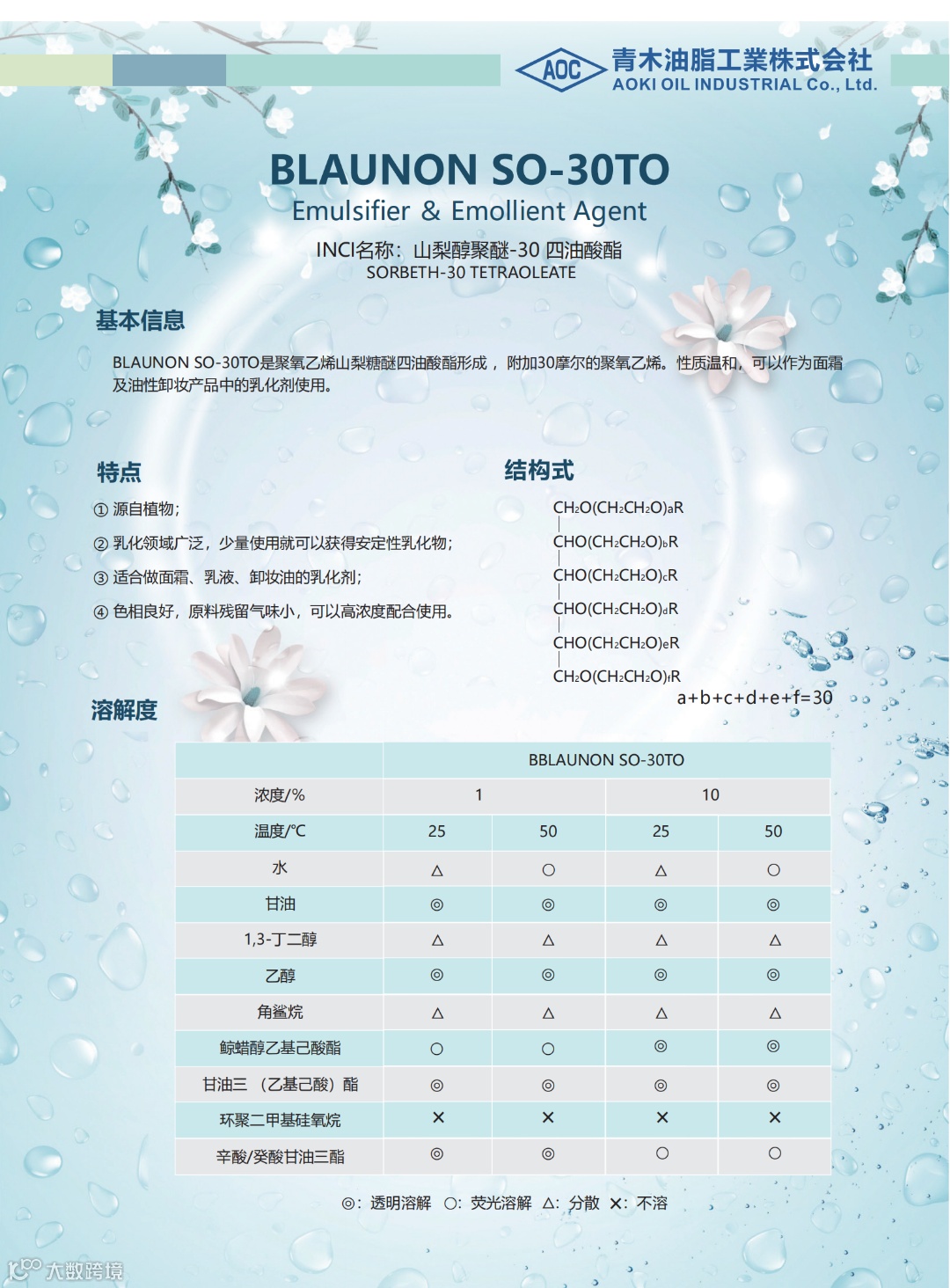 产品特点:兼容性优异的自乳化剂,洗净能力高,残留感低,肤感轻薄。不仅适用于全油膏卸妆体系,也适用于卸妆水体系辅助溶妆。