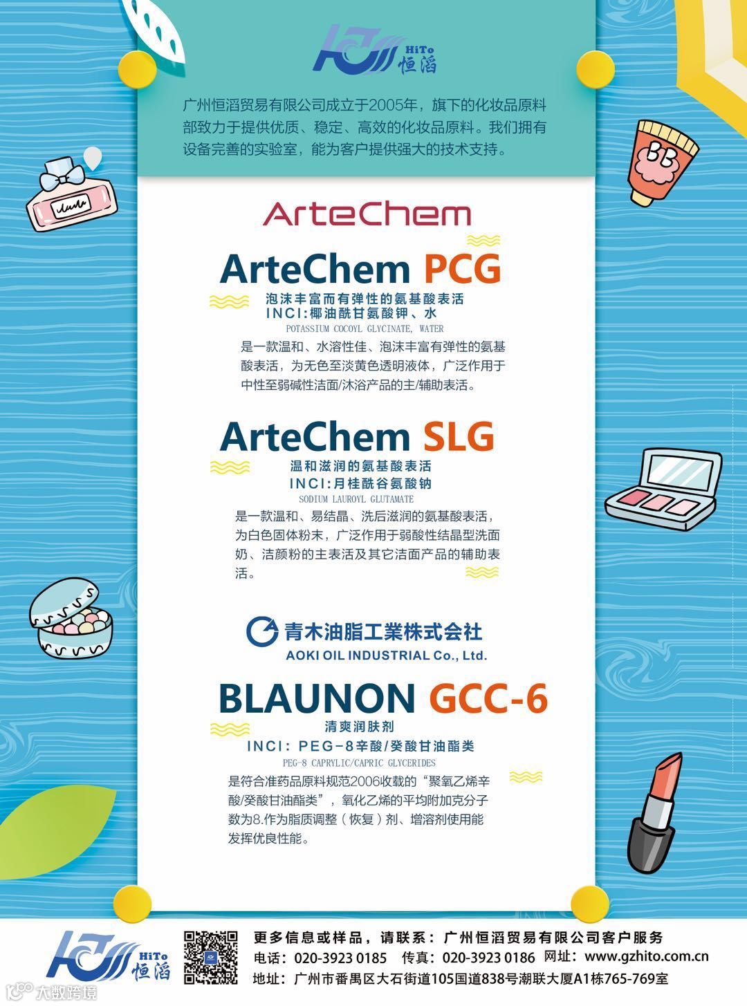 本次展会,我司将展出温和氨基酸表面活性剂及其他个人护理品原料,如ArteChem SLG、ArteChemPCG、ArteChemSCG、ArteChem SCA(S)、ArteChem CA、ArteChem C2M、BLAUNON SGL-20TISA、BLAUNON SO-30TO、BLAUNON GCC-6等。此外,我司的技术工程师还为本次展会研发了一系列洗卸类的成品。如需了解更多详细信息,欢迎到我司展位A43参观交流!