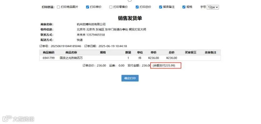 订单使用余额混合支付时,打印发货单展示余额支付部分金额