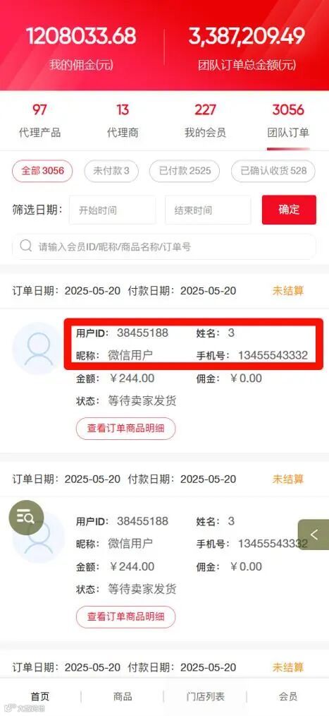 代理商团队订单列表默认展示ID、姓名、昵称、手机